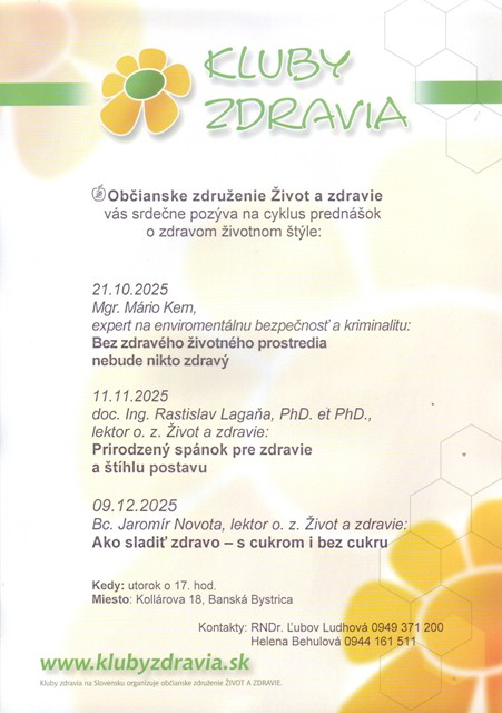 Občianske združenie Život a zdravie vás srdečne pozýva na cyklus prednášok o zdravom životnom štýle: